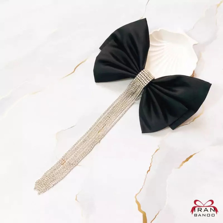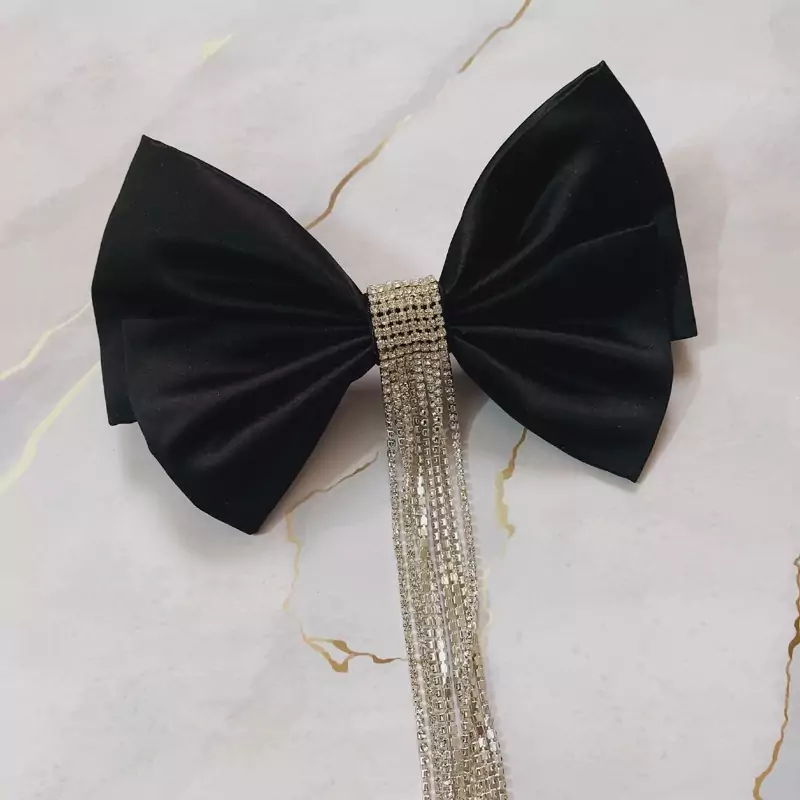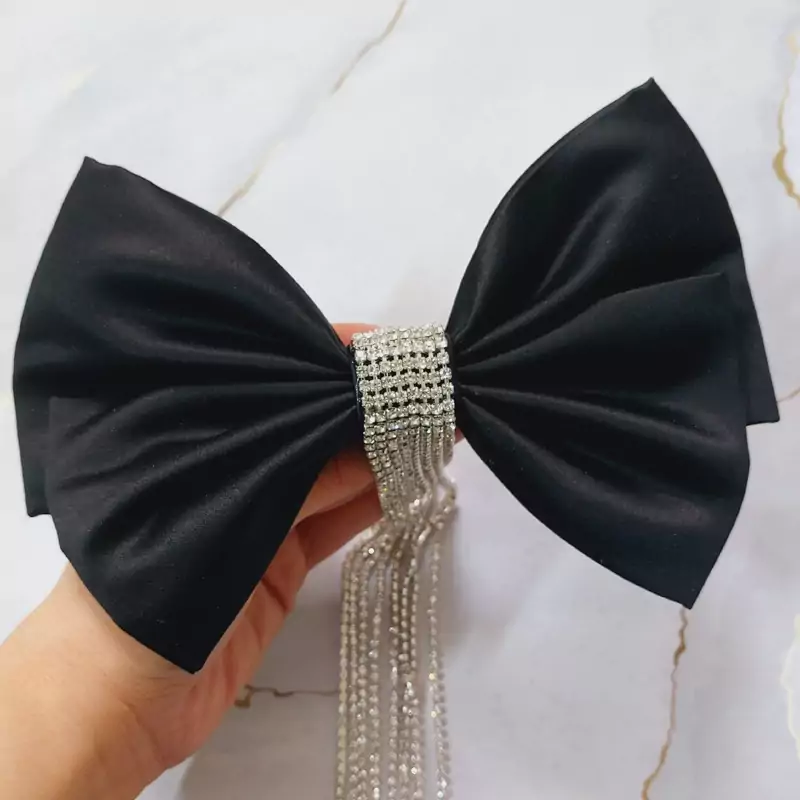 گیره فرانسوی پاپیون مجلسی فوقالعاده زیبا با ریسه نگینی 😍 ریسه ها 30 سانت هستند حدود 2/5 متر نگین به کار رفته پارچه ساتن آمریکایی مرغوب اندازه پاپیون 20 تا 21 سانت